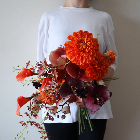 おしゃれ花嫁様に人気のテラコッタカラーブーケの中にピリッとしたお色味のチョコレートカラーコスモスがポイント♡ 可愛すぎない大人カラーの流れるデザインがトレンドのオーバルブーケです __ 新調するなら、永く使える上質なものを __ ◼︎前撮り→挙式→ご自宅インテリア→お子様やご家族のフォトで使用など永く楽しむことができる高品質アーティフィシャルフラワーです ◼︎ご自宅のインテリアのアクセントとして(高品質なアーティフィシャルの為 散ることも色の退色も少なく飾れます♡) ◼︎大切な方への明るい気持ちになる贈り物として (ギフト発送OK♡) ◼︎お子様のBDフォトディスプレイにも♡ ご結婚式のディスプレイやお子様のバースディ写真などさまざまなシーンで喜んでいただいております。 【こんな方に】 ⚫︎美しく高品質でおしゃれなアートフラワーをおしゃれに楽しみたい! ⚫︎散ることや退色が少なく長期間安心して飾れるインテリアが欲しい 本物と見間違う様な高品質なアーティフィシャルフラワー 花嫁様にも大人気の花材をまとめたブーケをご用意致しました♡ イメージを崩さない範囲で花材の変更がある場合もございます。それもわくわく楽しんで頂けますと幸いです^^その他お気軽にお問い合わせください。 先取りおしゃれで一気に差のつく空間も演出のできるデザインです 縦30〜40㌢前後 ↓ その他ブーケデザインはこちら ↓ ▶︎ブーケデザインInstagramにて日々更新中! ※全国への発送を承っております。オーダー順に発送しておりますのでお日にち指定などございましたら ご予約の際に伝えていただけると発送もスムーズかと思います♡ よろしくお願い致します。 【creema検索ワード】 アンモニウム カラーリリィ プレゼント ギフト 花束 ブーケ スワッグ 壁掛けインテリア お礼 誕生日 お祝い 新居 リラックス ディフューザー アロマ 癒し 母の日 結婚式 祝花 開店祝 新築祝 誕生日 結婚記念日 ブライダルフラワー 敬老の日 新生活 ドライブーケ おしゃれ インテリア グリーン 植物 リース 花 個性的 ドライフラワーの花束 ナチュラルブーケ キングプロテア